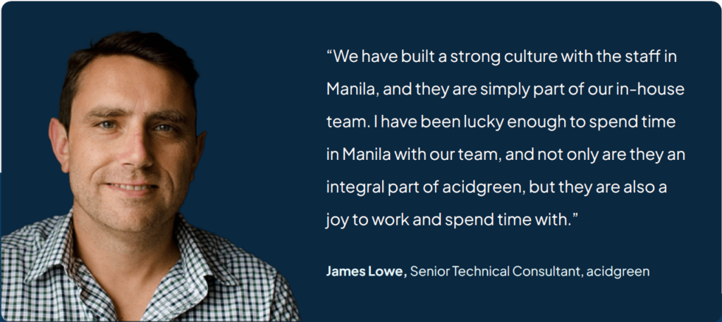Acidgreen’s outsourced staff are divided into teams, each with a manager in Sydney who communicates with them daily via Slack and other methods. There are also weekly work-in-progress reports and regular in-person meetups between the Philippines and Australia. These tactics heighten the quality of communication and support team cohesion despite staff usually being based in different countries.